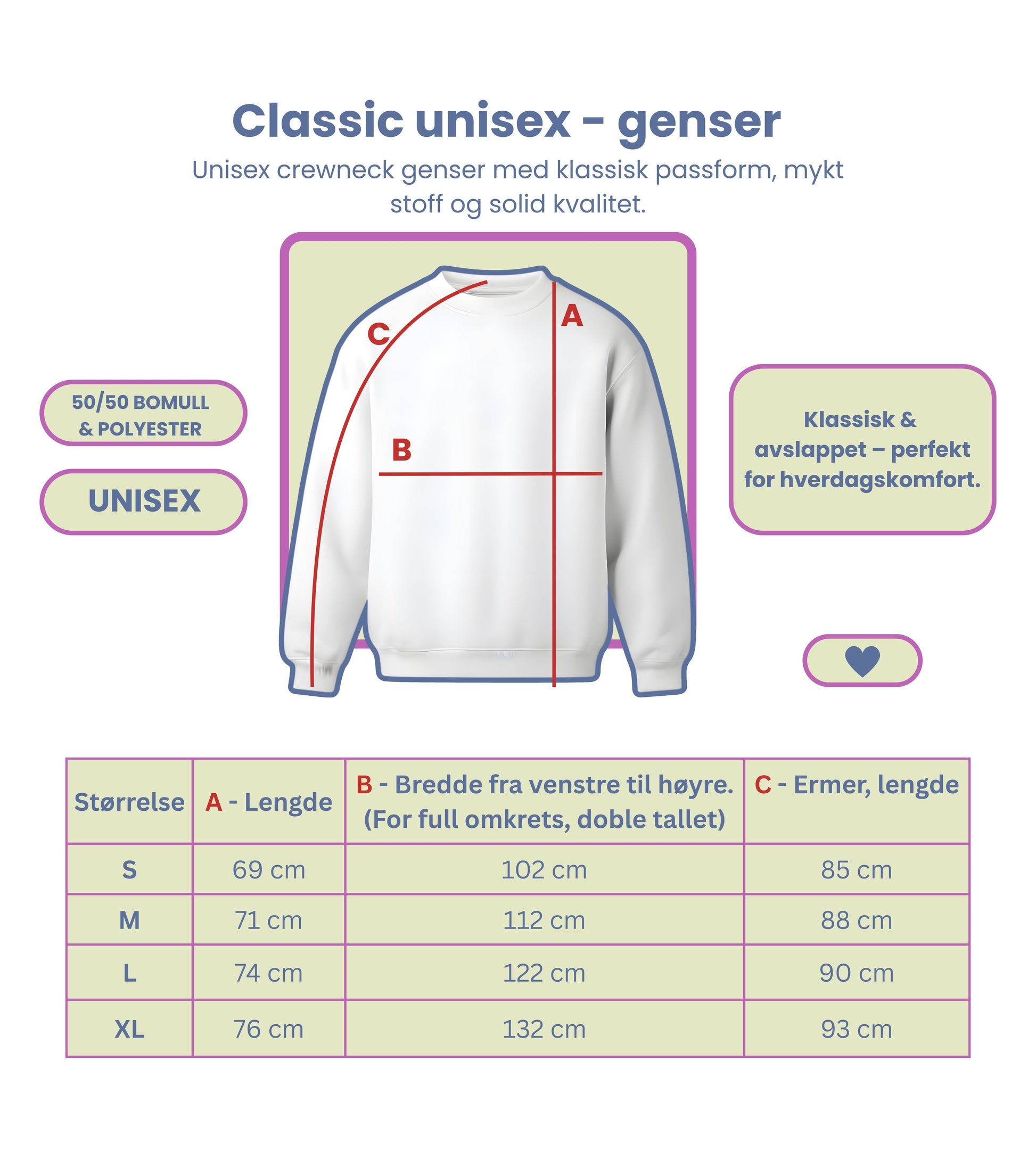 Størrelse: Unisex passform med litt lengde og elastisk kant nederst og ved ermene. På meg (161 cm) er M litt oversize i ermer og kropp.